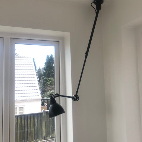 Flot sort væglampe fra Flos designet af Paolo Rizzatto. Lang arm med ledning ned langs væggen, god som læselampe over sofaen.