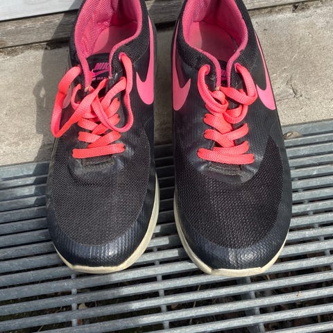 Nike løbesko i str 39 med snørebånd og åndbart mesh i sort, pink og grøn. Har kraftig gummisål med mønster under for godt greb.