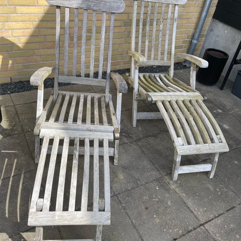 To havestole i teaktræ med armlæn og lameller i sæde og ryg. De kan klappes sammen og har et enkelt, klassisk udtryk til terrassen. Sælges samlet for kr. 600,/