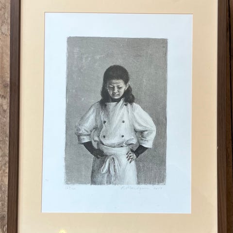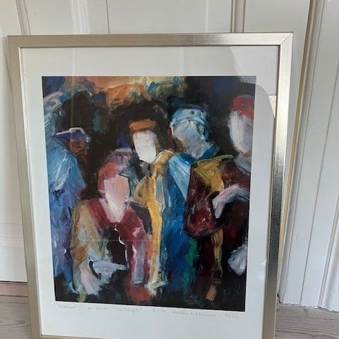 Litografi med sign. Og ea i blyant med motiv af flere personer, signeret og nummereret nederst. Sidder i lys træramme med passepartout.