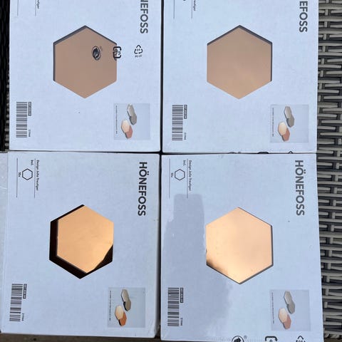IKEA HÖNEFOSS sekskantede spejle i pakke, gode til vægdekoration. Forskellige nuancer, kan sættes op i mønster som man vil.