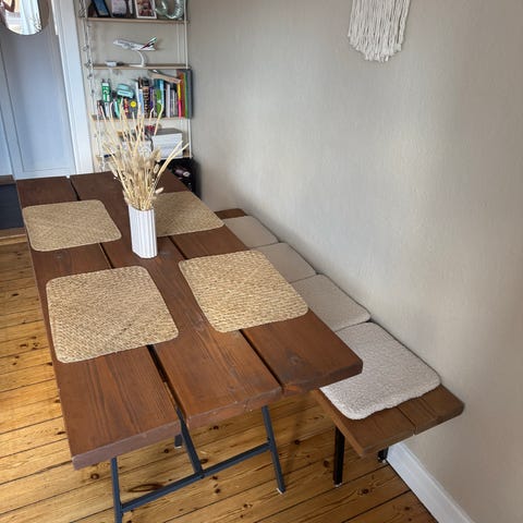 Flot og solidt plankebord med tilhørende bænk sælges. Bordet har været brugt i ca. 2,5 år og fremstår i rigtig god stand.