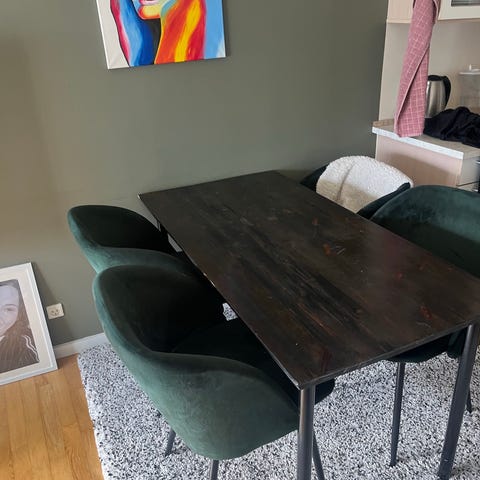 Flot aflangt spisebord i mørkt træ med ovale ender. Står på solide ben med tværstiver og har god plads til flere stole rundt om.
