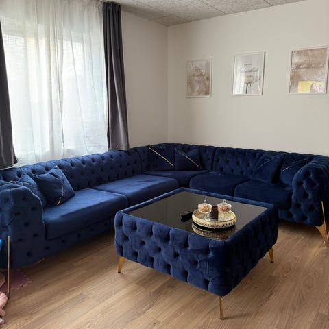 Super fed og elegant chesterfield hjørnesofa i Riviera sort velour med guld farvet ben.