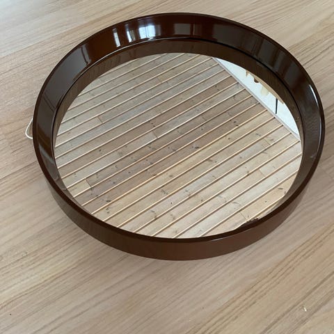 Flot massivt træspejl med facetslebne kanter. Synlige brugssport i selve spejlet.