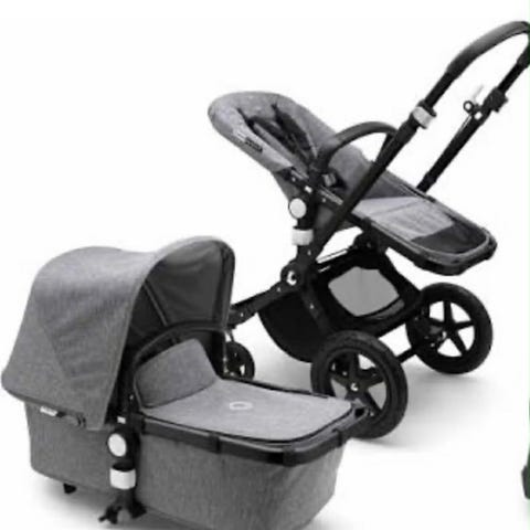 Bugaboo barnevogn/klapvogn i lys grøn med sort stel og drejehjul foran. Har stor varekurv under vognen og matchende barnevognsdel. Medfølger bugaboo barne/klapvongns taske i sort og regnslag.