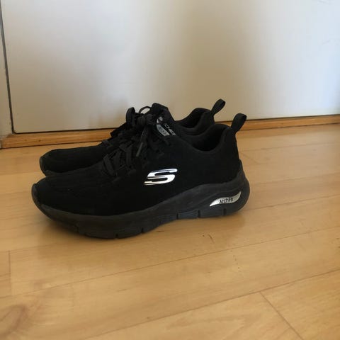 Sorte Skechers Flex Advantage træningssko i str 43 med snørebånd og mønstret mesh-overdel. Blød indersål og fleksibel ydersål, gode til fitness og hverdag.