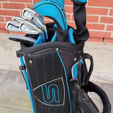 Callaway X-20 glasfiber skaft, med flere køller i Spalding vognbag med mange lommer og rum. Tasken har bærehåndtag, lynlåslommer og regncover øverst. Damesæt