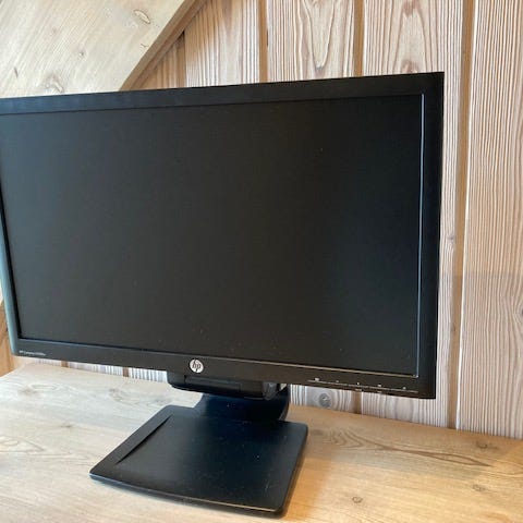 computerskærm på 25" i sort. Står på en flad fod og har knapper i siden til styring af billedet.