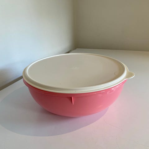 Stor røreskål i hvid plastik med matchende låg. Perfekt til at bagning, eller til en stor salat til sammenskudsgilde.
