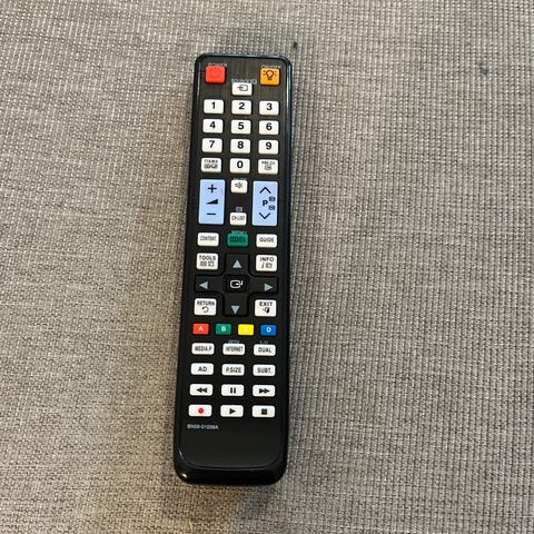 fjernbetjening i sort med volumenknapper og navigationsknapper. Bruger almindelige batterier på bagsiden med dæksel, der er nemt at tage af og på.