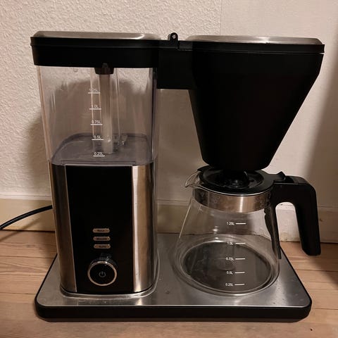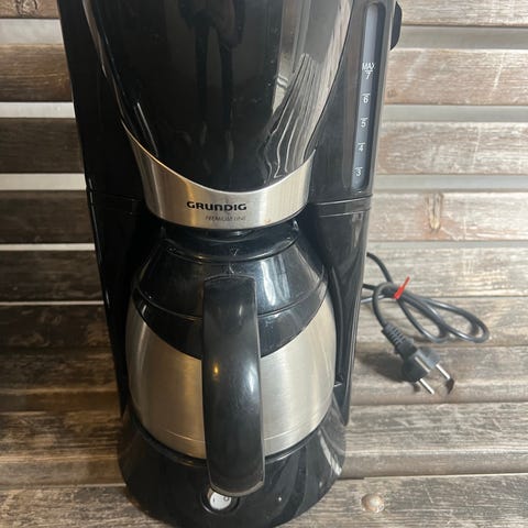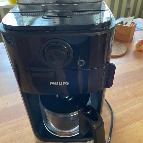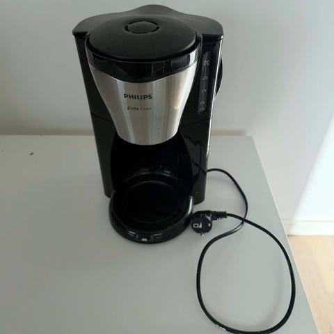 Philips kaffemaskine i sort med termokande i rustfrit stål. Har tænd/sluk-knap foran og aftagelig kande med håndtag.