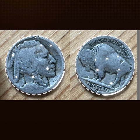 Amerikansk 5 cent Jefferson nickel mønt fra 1944 med P-mærke over bygningen på bagsiden.