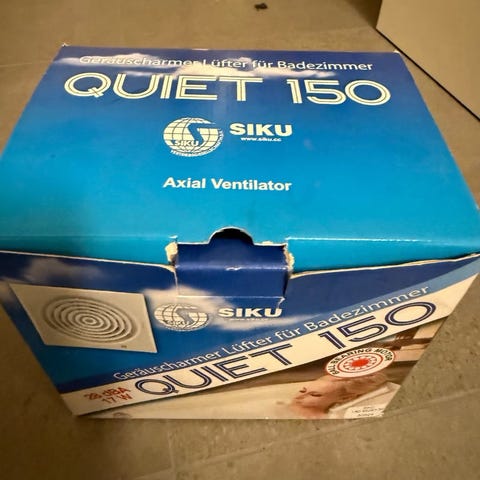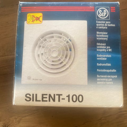 Hvid badeværelsesventilator med frontgitter og rund kanaltilslutning. Sælges som på billederne med den viste model. 100mm købt i Harald Nyborg, aldrig brugt.
