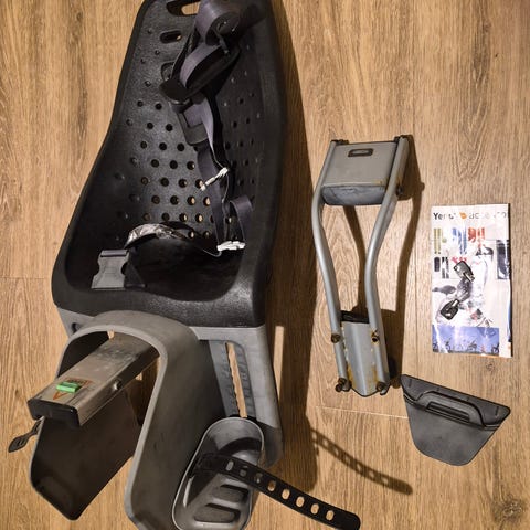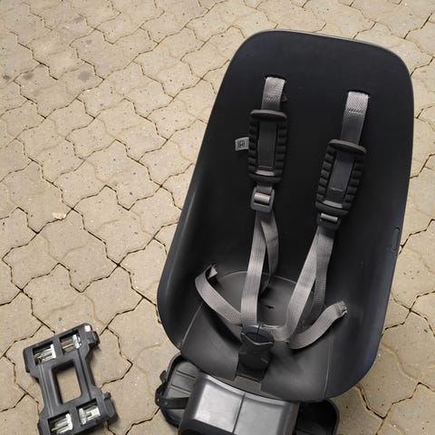 Bobike cykelstol i olivengrøn med sele og justerbare fodstøtter, med tilhørende vindskærm og blødt håndtag, samt beslag til montering på cyklen. Egnet for børn med vægt på 9 til 15kg