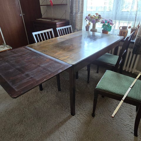 Gammelt spisebord 120x80 med udtræksplade + stole gives væk