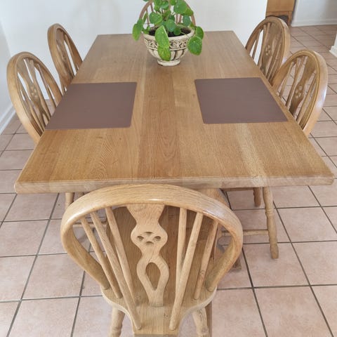 Spisebord med 6 stole og 2 tillægsplader i massiv bøg i fin stand, med det trænger til en rengøring.