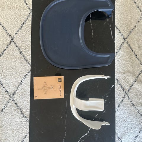 Stokke Nomi hvid babystol-bøjle til højstol. Jeg sælger også et blåt bakke bord, og en stokke sele.