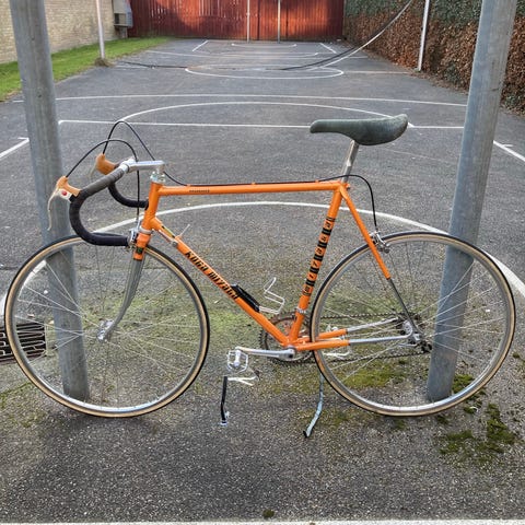 Peugeot vintage racercykel stel i rød med grafik på skrårøret. Der sidder krank og pedalarm på, klar til at bygge videre på som projektcykel.