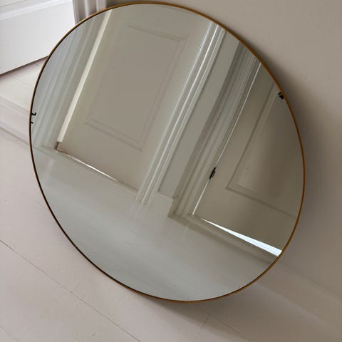 Fint Ferm Living vægspejl med rund, organisk form i farven brass.