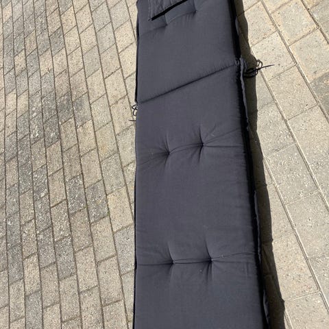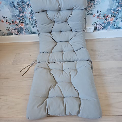 Grå hyndemadras til liggestol eller solseng med quiltede felter. Har stropper i siden til at binde den fast på stolen.