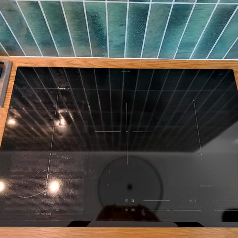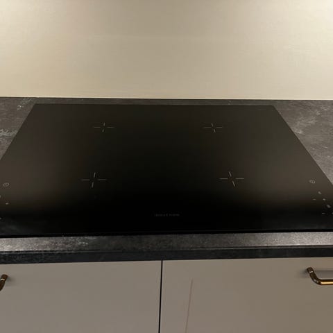 Sort induktionskogeplade med glaskeramisk overflade fra Witt. Har touchbetjening på fronten og flere kogezoner markeret på pladen. Selve kogepladen er 70 cm bred, men den passer stadig ned i et 60'er skab.