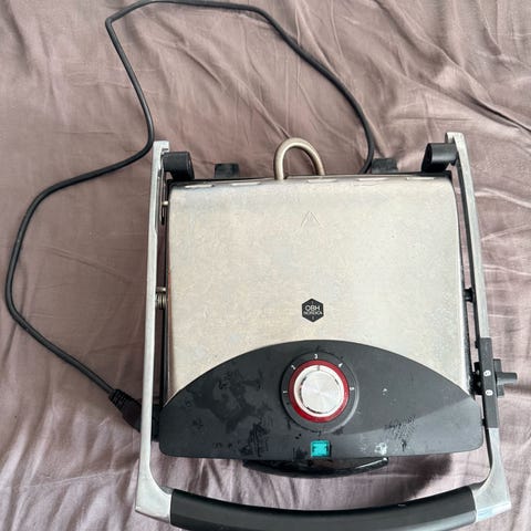 Lækker paninnigrill/bordgrill. Brugt meget få gange. Kan stege bøffer med høj varme, lave lækre paninnier og grøntsager mm. Den kan indstilles til forskellige højder. Drypbakke og aftagelige grillplader, for nem og hurtig rengøring.