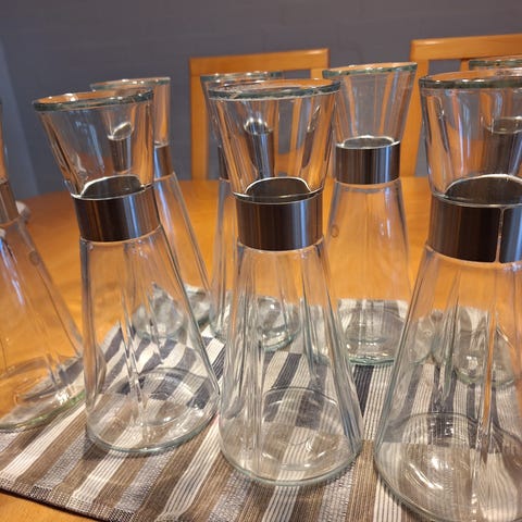 Flotte glas kander/karafler fra Rosendahl med bred bund og metalring om halsen. Sælges samlet og pris er så lav pga kalk du selv skal fjerne.