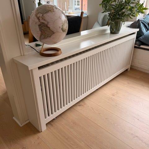 Hvid radiatorskjuler med lodrette lameller, der dækker en lang radiator under vinduet. Står på små ben