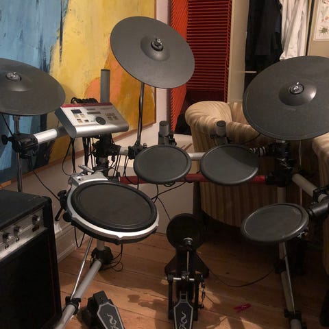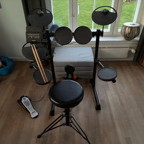 Yamaha DTX elektronisk trommesæt med flere pads, hi-hat og to pedaler. Der følger trommestol, trommestikker og høretelefoner - alt hvad du har brug for at komme i gang.