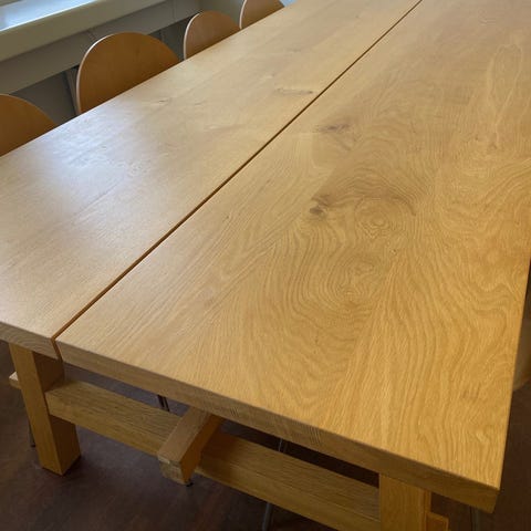 Lille snedkerbygget skrivebord fra røgfrit hjem. Egnet til en lav person/stort barn. Fine detaljer ved ben, få og overfladiske brugsspor. Tror det er eg.