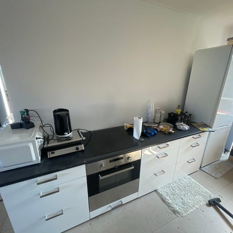 Ovn og kogeø medfølger, virker dog kun delvist. Køleskab og opvasker følger ikke med.