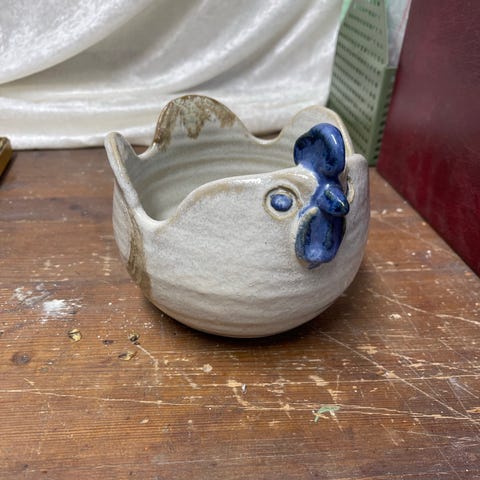 Fin keramik høne fra Anina Bornholm med åbning i ryggen, som kan bruges til fx småting eller en plante. Har prikket glasur og udskårne detaljer i siderne. Kun afhentning.