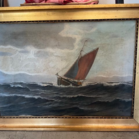 Oliemaleri af Chr. Møllgaard fra 1934 med motiv af sejlskib og dampskib i havn, titlen “Københavns Red” står på bagsiden. Maleriet er indrammet i en mørk træramme med gylden kant og er klar til ophængning.