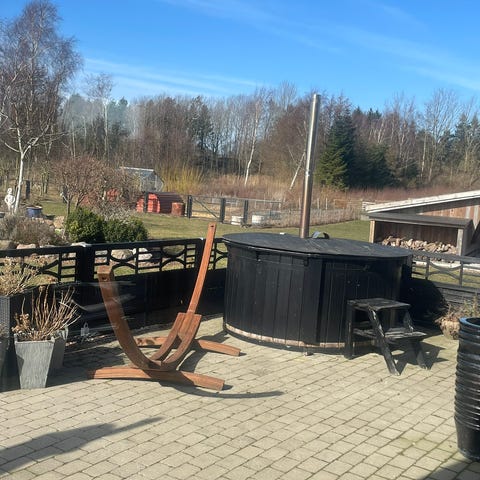 Rundt vildmarksbad med hvid inderskål og træbeklædning udenpå. Har indbyggede sæder, nakkestøtter og lys