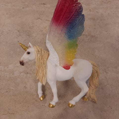 Sæt med Schleich enhjørninger og fe-figurer med blå og lyserøde detaljer. Flere forskellige figurer bl.a. med vinger.