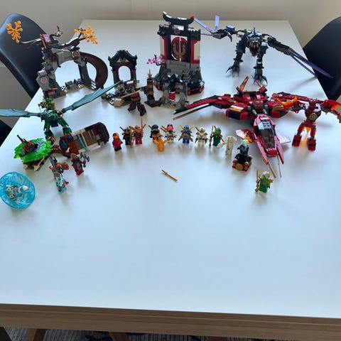 LEGO NINJAGO samling med flere køretøjer og drage-lignende figurer.