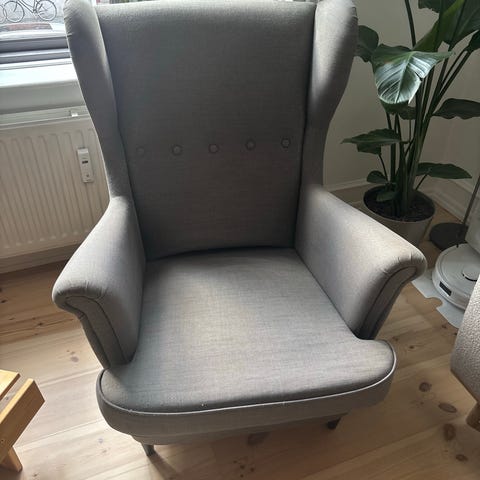 Solid og behagelig lænestol. God at sidde i. Betræk er slidt pga kat. Kan ombetrækkes.