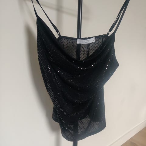 Sølvfarvet tanktop fra Sisters Point i str M med tynde stropper. Lavet i polyester med små skinnende prikker i stoffet.