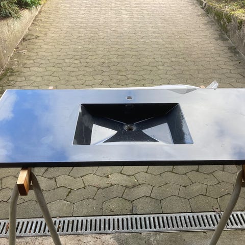 Concepta Diamond 1 vask/håndvaskplade i hvid mat, model 80BV38, længde ca. 122,5 cm. Med rektangulær kumme, hul til armatur og overløb, mål er på billedet
