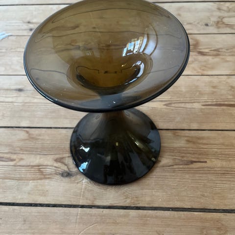 Glas fad i røgfarvet glas. Diameter 25 cm. Højde 10,5 cm. Fremstår uden skår, revner eller afslag. Kan sendes. Fragtomkostninger kr 53,-.