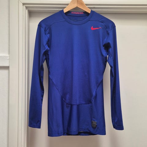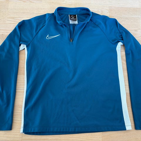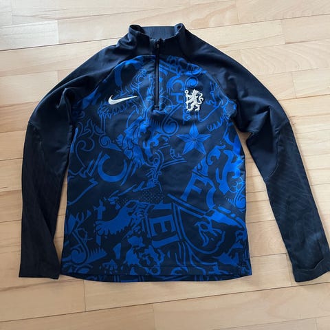Original Nike PSG fodboldtrøje i str 137-147 med lynlås i halsen (half zip). Har tommelfingerhuller i ærmerne og mønster på underarmene. Brugt men i rigtig god stand!