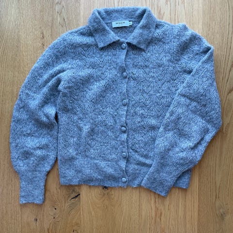 Blå H&M cardigan i str S i bomuld med korte ærmer og knaplukning foran. Har to små lommer foran med ribkant og krave i rib.