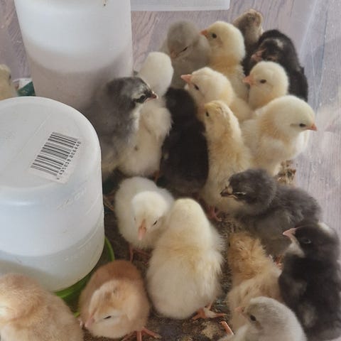 Søde små kyllinger i forskellige farver, lige klar til at komme videre til nyt hjem. De går her hos os med varmelampe og er vant til at blive håndteret. Det er klækket den 24-5’25 april Inge rugeæg