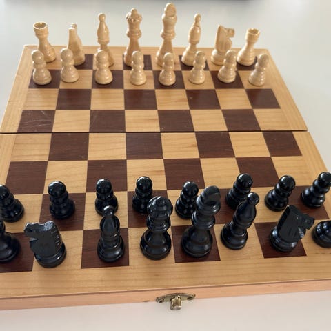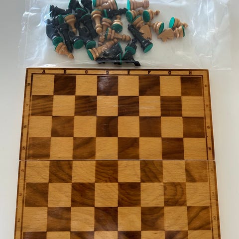 Fint træ skakspil med bræt der kan klappes sammen og lukkes med lille metalhægt. Brættet har markerede bogstaver og tal langs kanten og klassiske lyse og mørke træbrikker.