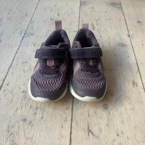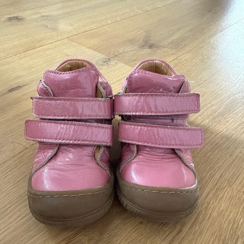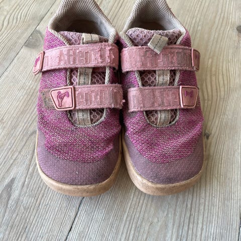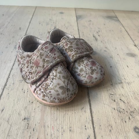 Søde Wheat sko til pige i str 21 i lyserød med små blomster. De har velcrolukning og fleksibel gummisål med mønster under.