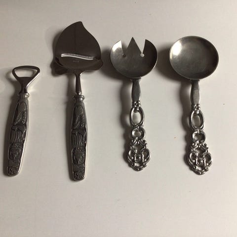 Sødt lille sæt AYTM børnebestik med ske og gaffel i metal. Håndtagene har præget figurmotiv på begge sider og riflede striber, der gør dem nemme at holde på for små hænder.