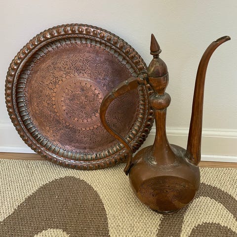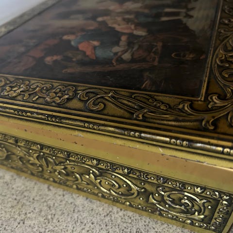 Fint bronze fad med indgraveret motiv af figurer og dyr. Rektangulær form med let buede kanter og små fødder under bunden. Længde 29,5 cm. Kun afhentning