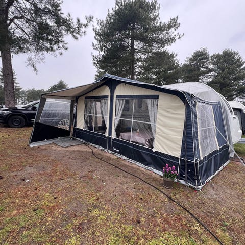 Der medfølger en fastgjort tagboks, cykelstativ, bord, stole og service til fire personer. Der er en revne i forteltet, denne er repareret.