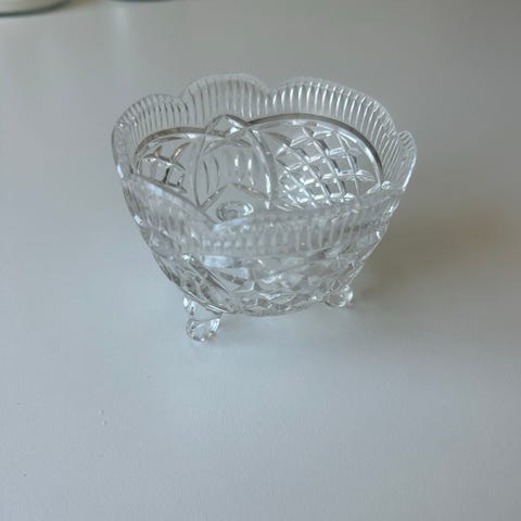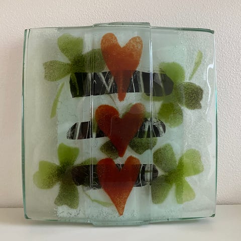 Vetri D`arte lille glasfad med farvet slikfigur. Har flere farvede felter og små dekorationer i hjørnerne. Kun afhentning